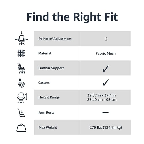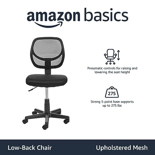 Amazon Basics Rolling Desk Chair, Adjustable, Low Back, Padded Seat, Breathable Mesh, Swivel, Black, 21.25″ D x 22.5″ W x 38″ H