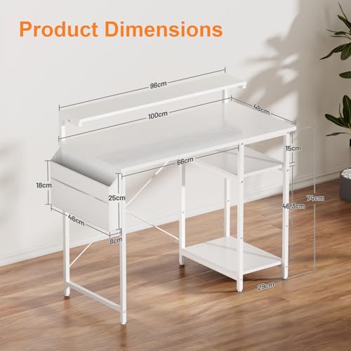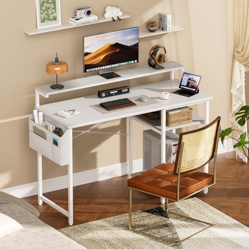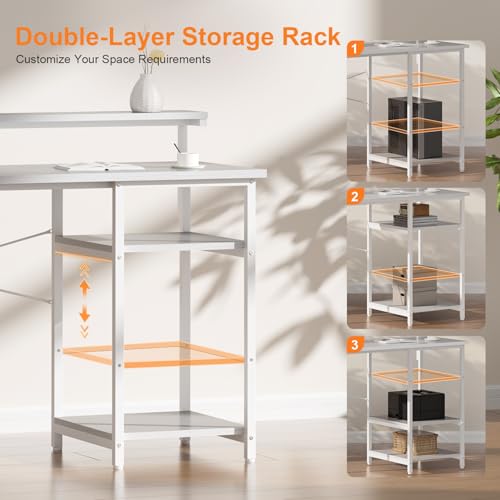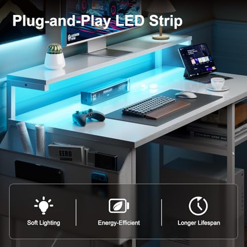 HLDIRECT Computer Desk with LED Lights, 40Inch Gaming Desk with Monitor Stand & Side Storage Shelves, Writing Study Table with Storage Bag for Home Office and Bedroom, White