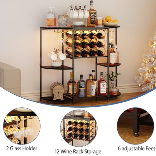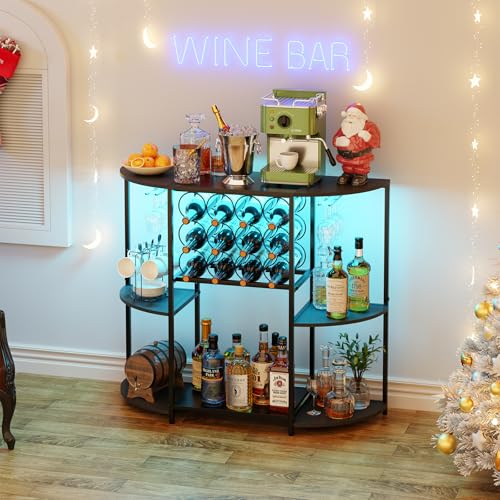 JKsmart Wine Bar Cabinet with LED Lights, Mini Wine Bar Cart with Storage and Glass Holder, Home Bar Coffee Bar for Liquor, 3-Tier Bar Table for Kitchen, Dining Room, Living Room, Black