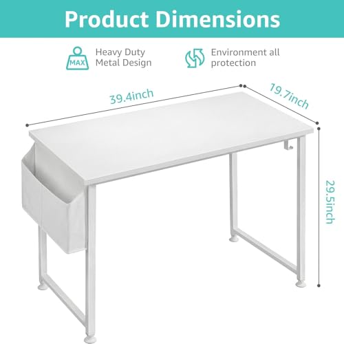 Modern Simple Style Design: Desk is made of thick Particle board with scratch-resistant, anti-collision and waterproof, protect home office desk surface from daily wear and tear, White desktop match White metal frame ,with storage bag and Headphone hook ( Both Removable )