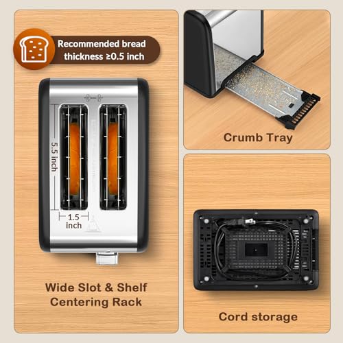 【Easy to Clean and Maintain】: The non-stick, food-grade stainless steel slots and a removable crumb tray make this 2-slice toaster easy to clean. Keep your kitchen mess-free with minimal effort and enjoy a hassle-free toasting experience.