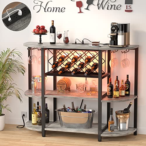 Unikito 4-Tier Metal Coffee Bar Cabinet with Outlet and LED Light, Freestanding Floor Table for Liquor Glass Holder Wine Rack Storage, Bakers Kitchen Dining Room, White Oak